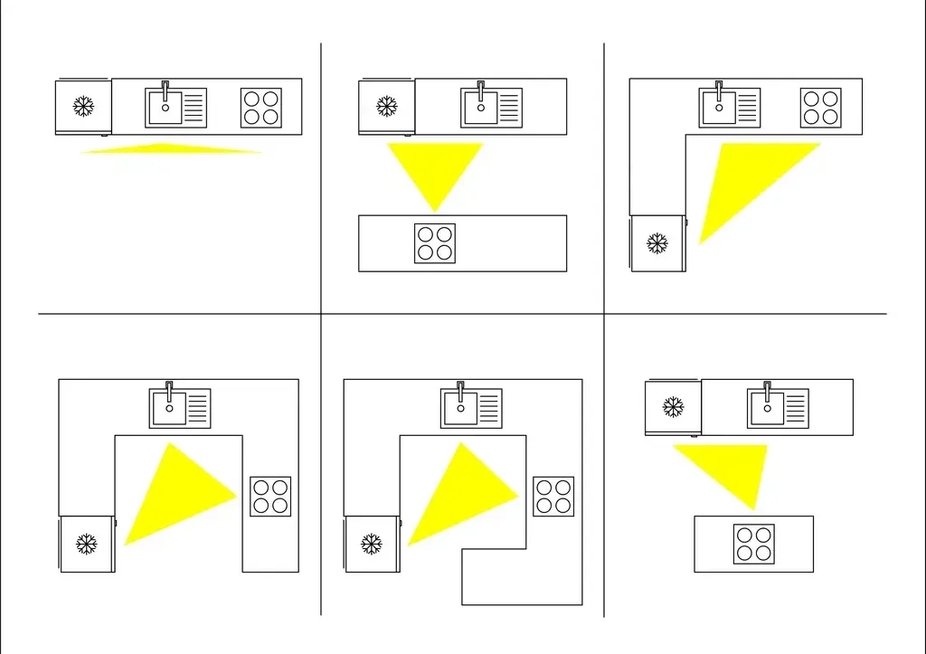 Trojice lednice – dřez – sporák tvoří tzv. pracovní trojúhelník. Ideální je, když tyto body nejsou od sebe příliš vzdálené, ale ani příliš blízko. Doporučená vzdálenost mezi těmito body je 120–270 cm a tvoří pomyslný trojúhleník.